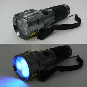 被照射体へのUV反応作用が明確 ●熱を持たず、長時間点灯(単4電池×3本 約20時間点灯) ●ボディは腐食に強い高性能アルミ仕様 ●ちょっとした雨でも安心、防滴仕様 ※UVピーク波長375nm。
