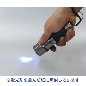 動作確認は暗い場所や、ブラックライトの光に反応する蛍光物質を含んだものに照射をして、お確かめください。