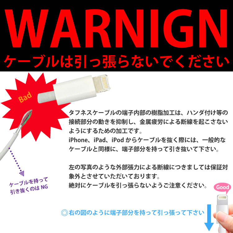 商品名 iPhone用タフネスLightningケーブル 長さ 20cm/1m/2m(いずれも±10mm)からご選択ください 確認済み対応機種 iPhone7 iPhone7Plus iPhone6S iPhone6SPlus iPhone6 iPhone6Plus iPhone5S iPhone5C iPhone5 等、Lightningケーブル(ライトニングケーブル)が使用できる機器 非対応機種 ケーブルが長くなるほどケーブル内での電力消耗が大きくなります。
