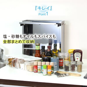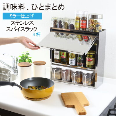 [6日10時迄!最大400円クーポン] ステンレス製 スパイスラック 調味料ラック ポット4杯 日本製 調味料ラック 扉付き マグネット コンパクト 調味料入れ おしゃれ スパイス 収納 ラック ミラー 3段 キッチン収納 調味料ポット キッチンラック 燕三条 完成品 川口工器