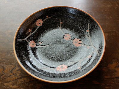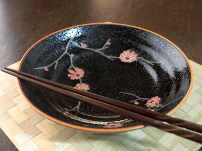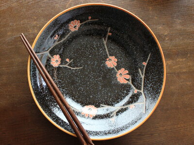 【アウトレット】 花夢路7.5麺皿(約Φ23cm×h5cm) 表側が黒地に和の花柄、そして裏側はまだら模様になっている趣きのある麺皿です。