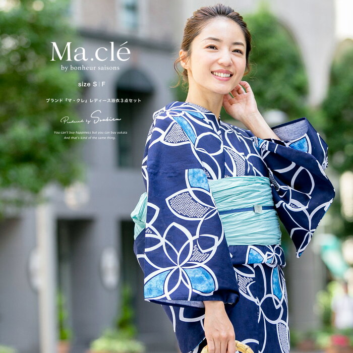 【9/4~11 20%OFF■全品クーポン1000円OFF】浴衣 セット レディース レトロ 浴衣セット 3点セット 紺系 ネイビー 青 花韮 鹿の子 綿 モダン 兵児帯 女性 ボヌールセゾン マクレ 30代 40代 ママ 大人浴衣 S フリー 【送料無料】【あす楽対応】【浴衣 セット】