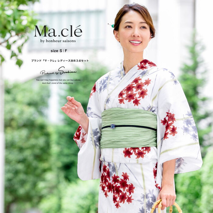 【9/4~11 20%OFF■全品クーポン1000円OFF】浴衣 セット レディース レトロ 浴衣セット 3点セット 白 ホワイト 赤 グレー ツツジ つつじ 躑躅 花 綿 兵児帯 女性 ボヌールセゾン マクレ 30代 40代 ママ 大人浴衣 S フリー 【送料無料】【あす楽対応】