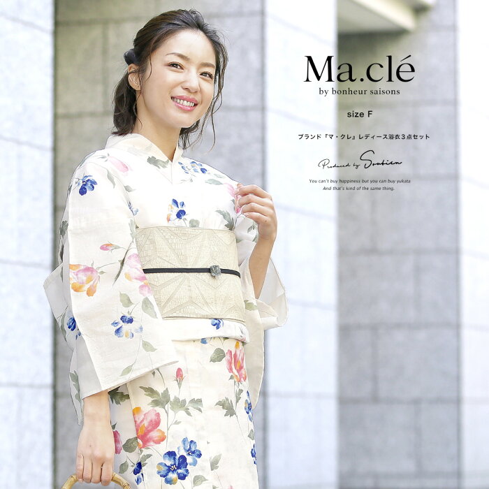 【9/4~11 20%OFF■全品クーポン1000円OFF】浴衣 セット レディース レトロ 浴衣セット 3点セット 白系 ホワイト 青 ピンク 花芙蓉 ラメ 綿麻 手捺染 手縫い 兵児帯 女性 ボヌールセゾン マクレ 30代 40代 ママ 大人浴衣 フリー 【送料無料】【あす楽対応】【浴衣 セット】