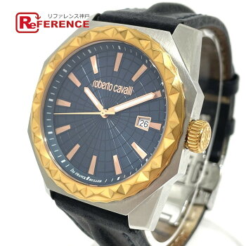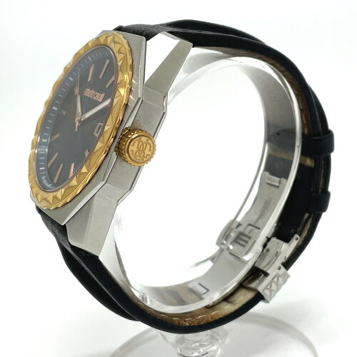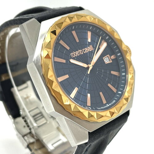 Roberto Cavalli ロベルトカヴァリ RV1G018 byフランクミュラー クォーツ デイト 腕時計 SS/GP /レザーベルト メンズ シルバー×ゴールド 【中古】